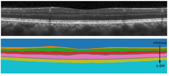 DSC values were computed between manually corrected segmentation using the SAMIRIX toolbox and the proposed method’s outcome for nine classes for CUB and UCLA. The corresponding values are reported in Table 6, where vitreous is the region above ILM and b-BM is the region below BM, as shown in Figure 7. As can be seen from Table 6, the first and the last classes (vitreous, b-BM) yield the highest DSC values (close to 1) as the differences between the numbers of background and foreground pixels are small. Moreover, OPL has the lowest value of DSC since this is one of the thinnest layers and the difference between the numbers of background and foreground pixels can be large. Compared to the state-of-the-art methods, our method produces better overall DSC scores (CUB-0.95, UCLA-0.94 and JHU-0.92), except [38,48], where validations are performed using HC data only.