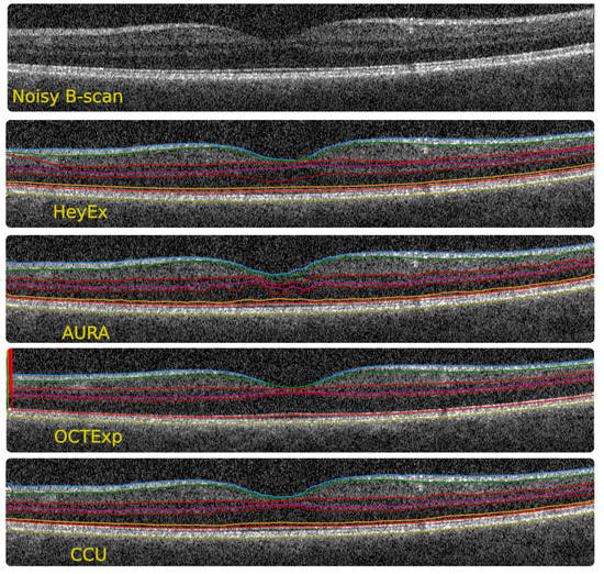 Example segmentation with a low-quality scan to show the performance of the proposed method compared to state-of-the-art methods (HeyEx—device segmentation, AURA [45], OCTExp [49]).