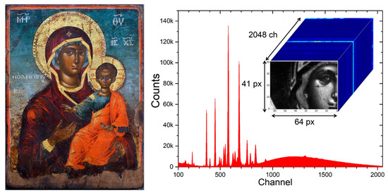 Scanning was performed in a step-by-step mode. An area of 64 × 40 mm2 was scanned, with a lateral step of 1 mm in x- and y- directions. A circular-shaped aperture in the direction of the excitation beam provided a beam spot described by a two-dimensional Gaussian distribution, with spatial broadening of about 800 μm (fwhm). The X-ray tube working conditions were 800 µA, 50 kV, while the acquisition time was 2 sec for each point, thus resulting in about 1.5 h of active time for data collection. In Total, 2665 spectra were collected and stored, one for every measured point. Each of the raw spectra reflects the distribution of the measured photons over the 2048 channels. The measured (x, y) spatial position and the corresponding raw spectrum define a pixel. The total 2665 pixels are stored in a hierarchical data format (HDF) format file, creating the X-ray cube (Figure 1-right). In this way, the total information contained in the cube allows effortless data management. As an example, the summation of intensities per channel generates the sum intensity spectrum (Figure 1-right).