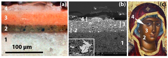 To demonstrate the typical structure of an icon, two photomicrographs of a characteristic micro-sample collected from a spot that depicts flesh is presented (Figure 2a,b); the first photomicrograph was captured through an optical microscope (OM) and the second using the backscattered electron detector (BSE) (the BSE detector allows for the differentiation of an observed phase on the basis of the atomic number of its constituent elements (the higher their atomic number, the brighter they appear) [37]) of a scanning electron microscope (SEM). This sample originates from an AD 1773 Greek icon that was painted by a Kapesovitis painter, such as the Virgin Mary icon in consideration. The sample’s cross section shows four distinct layers: the first (1) corresponds to the ground layer (“gesso”) on which the primary flesh color (2), the midtones (3) and the highlights (4) were applied. For reasons of convenience, a corresponding detail of the Virgin Mary icon with the various aforementioned paint layers marked on it is also shown (Figure 2).