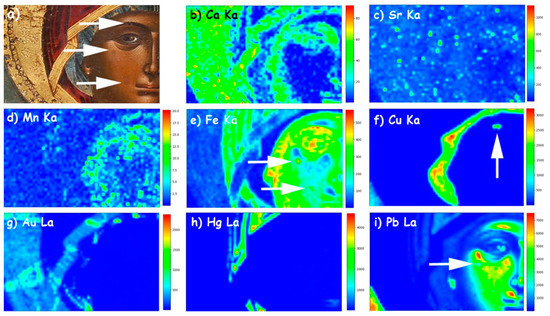 Lead is detected on the areas of flesh and especially on the midtones and highlights (Figure 3i), thus revealing the employment of lead white, which was practically the only white pigment used in panel painting until the 19th century [38]; note that lead white was extensively mixed with other pigments to impart brightness or/and body (Figure 2c). Lead is also detected on the bluish areas, especially in the case of the pale-bluish background (lower left corner) and, faintly, on the Virgin Mary’s kerchief, where it was probably mixed with a copper-based blue pigment; besides, copper blue pigments were widely used by painters of the era and area in consideration [26].