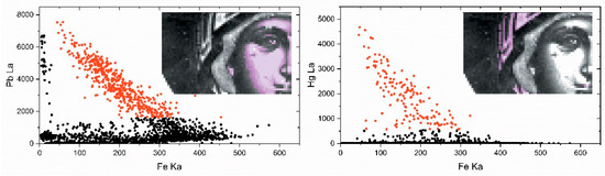 Iron is detected on the flesh, on the mantle and, faintly, on the halo and the fringe of the mantle (Figure 3e). In flesh areas, there is a strong correlation between lead and iron. The intensities of the Fe Κα and the Pb Lα transitions are negatively correlated as can be deduced from their scatter plot (Figure 4-left). Here, iron is detected due to the employment of ochre-type pigments, which, in the case of flesh renderings, are mostly mixed in the primary paint layers (layer 2 in Figure 2a–c). Therefore, iron fades and gradually “disappears” in the areas of high lead content simply because the iron-rich primary layers lay below numerous layers of lead-rich paints (lighter tones and highlights—layers 3 and 4 in Figure 2a–c). However, in the areas of maximum iron intensities, there is also a strong presence of manganese (Mn) (Figure 3d), and this hints towards the employment of umber (i.e., a Mn-rich iron ochre) [28,39]. Moreover, these areas coincide with dark contours and shadows, where an umber pigment was presumably used.