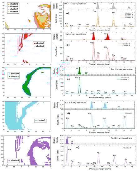 Spatial distribution of clusters (left); and corresponding X-ray emission spectra (right). On the top of the representative spectra is presented the X-ray spectrum of the dominating element, as evaluated by a Monte-Carlo simulation [44]. (a) Clusters 1, 5, 7 and 8. Pb Lα is the dominant transition. (b) Clusters 3 and 6; dominant transition: Hg Lα. (c) Clusters 0 and 2; dominant transition: Cu Kα. (d) Cluster 9; dominant transition: Au Lα. (e) Cluster 4; dominant transition: Fe Kα.
