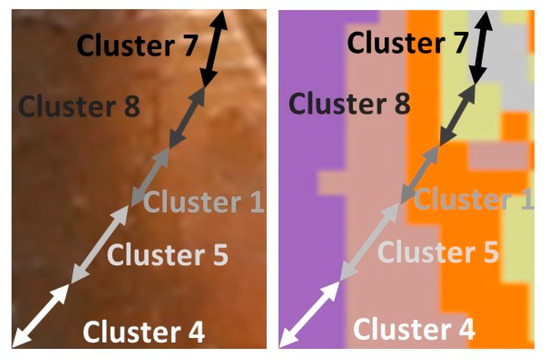 It should be emphasized that to apply k-means, the number of clusters K should be specified in advance. In our approach, this issue was tackled with the use of the silhouette criterion [15]. Silhouette is a measure used to evaluate the quality of a clustering solution ranging from −1 (highly overlapped clusters) to 1 (well separated clusters) [34]. Obviously, solutions with higher values are preferred. To use silhouette to select the number of clusters, k-means is executed for several values of the number of clusters K, each solution is evaluated using silhouette, and finally, the clustering solution of maximum silhouette value is selected. In our experiments, we considered solutions with more than six clusters and found that the k-means solution with K = 10 clusters provided the maximum silhouette score (≈0.52). Note that although less than seven clusters can achieve better scores, such a limited number of clusters does not allow for the analysis to be detailed. More specifically, a cluster number below seven would hinder the extraction of valuable information through the clustering process. In other words, for the present problem, we need more than seven clusters so the clustering results contain information with a level of detail suitable for our analysis objectives. For example, a cluster produced with K = 6, which corresponds to a specific part (color) of the painting, may consist of two or three parts (sub-clusters), each one highlighting the multi-layered structure of the painting. Thus, for, e.g., K > 7, the clustering output will contain these parts as concrete, separate clusters.