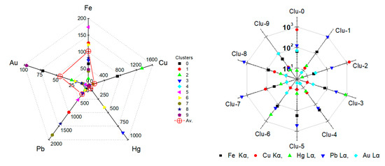 Finally, the spatial distribution of Cluster 4 and its representative XRF spectrum (Figure 6e) corresponds to the dark areas of the Virgin’s face and scarf. Fe K X-ray spectrum dominates this cluster, but the contribution of Pb L X-ray is also high. Moreover, Cluster 4 can be considered the continuation of Cluster 5, with the intensities of Pb and Fe inverted. In addition, weak transition intensities of Cu, Hg and Au are also recorded, obviously due to the extended borderline of the areal region of Cluster 4. Finally,, Cluster 4 occupies the center of the diagram and borders with all cluster groups.