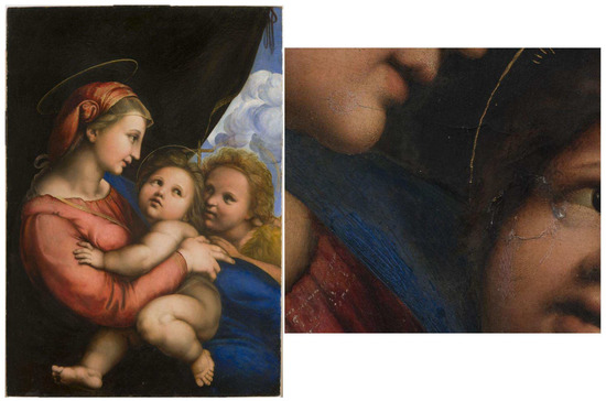 As a visible result, in correspondence with the hole, the wooden support is so thin that it has caused deformations and fractures on the pictorial film; moreover, in correspondence with the surface along the tau, other points of fragility were found, such as the one on the Virgin’s chin (see Figure 1).
