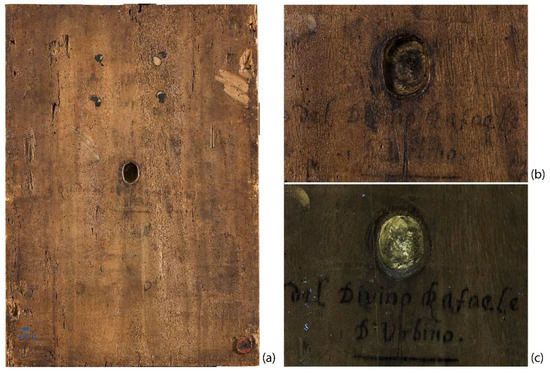 On the painting’s back surface, there are visible signs of woodworking and recessed parts, and a hollow caused, at first analysis, to the loss of a knot, subsequently widened: the edges of the hole are dug and engraved, showing traces of adhesive substances on the internal walls (Figure 2). In correspondence to the hole, the wooden support is so thin that it provoked deformations and fractures on the front of the painting (Figure 1). Additionally, on the back of the panel, signs of several changes of ownership and re-location for restoration purposes can be found—from the Porporati seal of Piossasco, to traces of inventory numbers, and the Milan customs wax seal. In the middle of the back, a black ink handwritten inscription is clearly visible: “Quadro del divino Rafaele Sanzio D’ Urbino” (Figure 2).