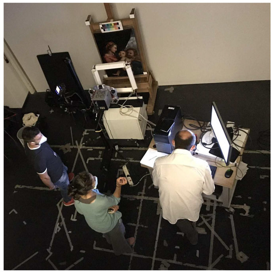 The UV-induced visible fluorescence (UVF) was acquired via a Nikon D810 full-frame DSLR camera (CMOS 7360 × 4912 pixel) and a Hoya UV-IR Cut filter (Hoya, Tokyo, Japan), irradiating the painting with two UV Labino® lamps (365 nm-emission peak). The NIR reflectography was performed using a Nikon D810 full-frame DSLR camera (CMOS 7360 × 4912 pixel), modified to extend the sensor sensitivity range up to 1000 nm, and with a B+W 093 (87c) filter, illuminating the painting using Ianiro Varibeam Halogen 800 W lamps (Ianiro, New Taipei City, Taywan) with indirect diffused light.
