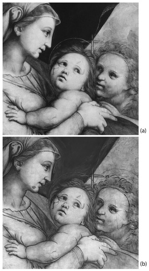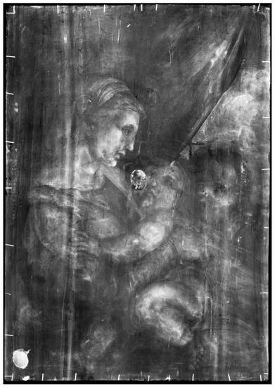 All the radiographic data are important, and conservators and art historians are usually very interested in the issues related to the support, considering the information coming from the paint layers precious indications to distinguish different stages of a painting, and to help infer the work of different artists’ hands and past restorations. It must be stressed that the combined information of the three-dimensional structure of a painting can lead to difficulties in interpretation when isolating information from a particular layer is needed. This segmentation can be obtained using different penetrating radiation, such as near-infrared (NIR), shortwave infrared (SWIR), and mid-wave infrared (MWIR) [10,11,12,13]. The first two are performed using the reflected infrared spectra from the painting surface, usually up to the preparation layer, while the latter is carried out by measuring the emitted infrared by the outer and the inner layers of the painting after a thermal stimulus. By combining NIR and SWIR multiband reflectography, it is possible to differentiate the underdrawing and pigments, highlighting specific features related to the drawing technique in order to map restorations, thanks to the different IR absorption properties of the pigments.