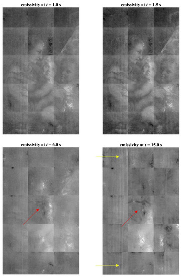 It is worth noting that the limitations of the penetration due to the preparatory layers can be overcome using IR thermography. IR thermography, either active or passive, is a well-established method for monitoring, assessing, and evaluating the integrity of different materials [14,15], including historical multi-layered structures such as frescos, canvas [16], and panel paintings [17], to mention a few [18,19,20]. Usually, the use of external heating sources, i.e., active thermography, provides more insight into the inspected item’s stratigraphy with respect to the use of passive thermography [21]. In fact, the heating source, e.g., a halogen lamp, is switched on/off following a known reference waveform in time, e.g., step-heating, sinusoidal modulation, or single pulse, to which analytical/empirical post-processing, and different data visualization methods can be applied for extracting useful information [22]. However, when dealing with irreplaceable items, such as the here-inspected panel painting, heating must be used carefully so as to avoid any potential for thermochromism and/or cracking due to exceeding thermal stress.