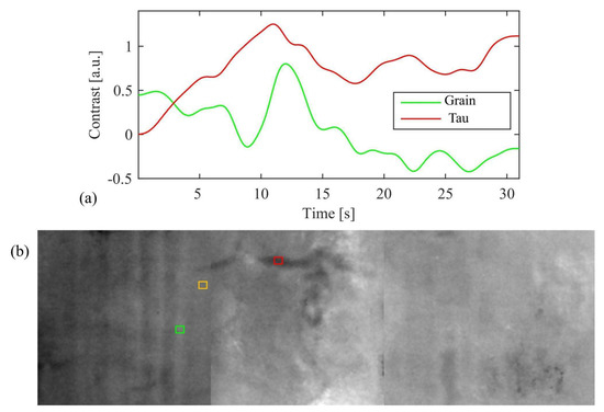 (a) Thermal contrast for the grain (green) and tau (red) pixel areas as a function of time. A maximum is reached for both quantities at t = 13 s; (b) a thermogram showing the investigated area at t = 13 s, marked to highlight the areas employed for computing the thermal contrast, i.e., tau within the red square, wood grain within the green square, and sound within the orange square.