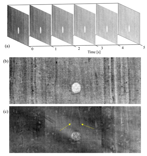(a) a series of thermograms at different time instants acquired from the back panel surface using PuCT; (b) same as (a), but for a single t = 4 s; (c) image obtained using the time-phase feature, with yellow arrows pointing towards the wood grain surrounding the hollow area.