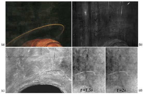 As observed in XR (see Figure 4), in many cases, the numerous woodworm tunnels follow the pattern of the wood fibers and are visible as a darker and less radio-opaque trace due to the lack of wooden material, whereas other vertical signs are more radio-opaque. Figure 8 shows an example of these signs in correspondence to the green curtain, which is painted with a copper-based green pigment. Along the more radio-opaque lines, a lower signal of copper is detected, as evidenced by the greyscale MA-XRF distribution map of copper (Figure 8c), where the lines appear less bright, while no other elemental differences are detected using the same technique. In the same area, a series of thermograms at different time instants acquired from the front panel surface using PuCT show these vertical lines as dark lines, becoming whiter as time elapses, suggesting that these have been filled and/or restored (Figure 8d). Therefore, these lines could be cracks filled with some radio-opaque compound, not better identified, that probably involves only the upper layers: in correspondence with such signs, in fact, the painting exhibits some micro-cracking, suggesting that they are probably on the surface of the painting and not inside the wooden panel, as is the case for the tunnels caused by worms.