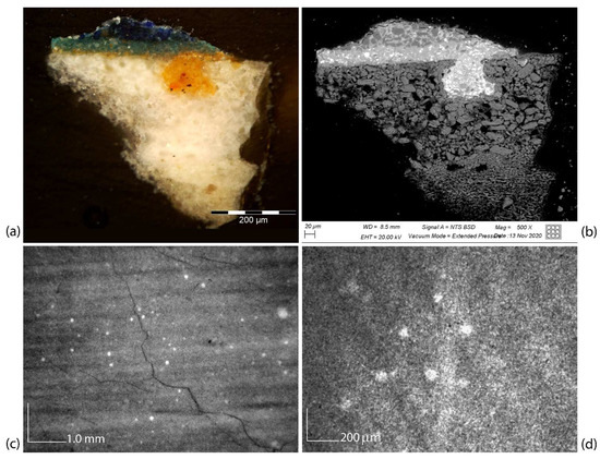 Looking at the painting’s XR at high magnification, numerous inclusions of more radiopaque material can be seen, appearing as the widespread presence of small, irregular white spots (Figure 9c,d). Comparing the cross section images (Figure 9a,b) with the radiographic details, it is possible to attribute their presence to bubbles formed during the preparation and mixing of the plaster; these bubbles during the smoothing of the preparation are opened and can be filled by the imprimitura, thus showing very radiopaque and diffuse dots on the whole surface of the painting. The average size of these inclusions corresponds to approximately 100 µm.