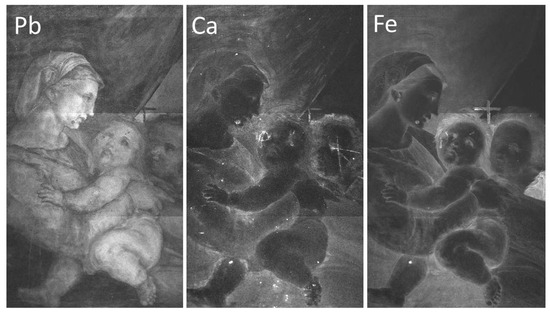 MA-XRF technique confirms the use of lead-, calcium-, and iron-based pigments for the preparation phases of the panel (ground and imprimitura), as evidenced by their distribution extended on the whole support shown in Figure 10. However, the information provided by MA-XRF is integrated along with the pictorial stratigraphy up to the preparatory layer and the contribution of Pb, Fe, and Ca signals, shown in Figure 10, comes not only from the preparatory layer but also from the pigments or compounds that compose the upper layers. In particular, the lead white pigment was also used for obtaining the characters’ skin tones and the highlighting effect on the robes and curtain. In the same way, iron-based pigments, presumably ochres, were used for painting the brown tones such as the characters’ hair. Finally, calcium-based pigments are not present in the superficial pictorial layers, except for in small regions affected by restorations, such as grouting or fillings. In addition, due to the chemical nature of the pigments, the stratigraphic structure of the painting can make the detection of low-energy fluorescence lines difficult, especially when the low Z-elements, such as calcium, are present in the deeper layers. Indeed, the emitted fluorescence is almost completely absorbed in the thicknesses of the upper layers composed of heavier elements, such as lead or copper. This absorption effect is visible in the maps of Figure 10, observing the Ca and Fe signals coming from the preparation; these are strongly absorbed in the upper layers characterized by Lead white-based areas of paint.