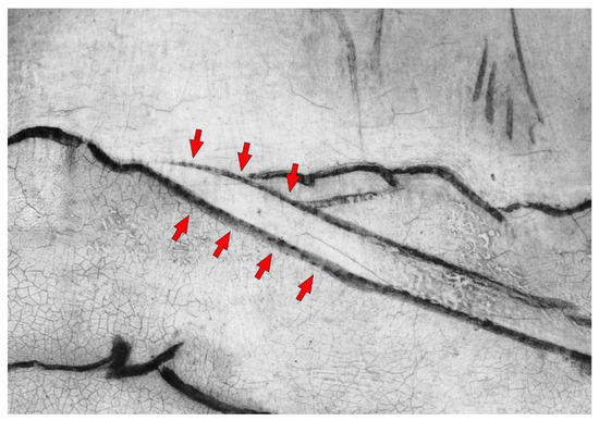 The underdrawing is clearly visible using infrared reflectography, as shown in Figure 11. The NIR image (Figure 11a) allows for a view of the main traces, but it is still limited by the low ability for penetrating all the pigment layers. HR-SWIR reflectography (Figure 11b) is instead able to highlight all the details, even in those areas with darker or copper-based pigments: it shows a very detailed, clean, and skillful stroke by means of an underdrawing made with a brush and a fluid carbon black ink. Additionally, it allows for hypothesizing the presence of a preparatory cartoon transferred using punched dots and carbon powder. Some punched dots are barely visible in correspondence to the underdrawing (Figure 12), probably because of the use of a brush for their removal and because they are diluted in the main underdrawing traces completed freehand. Lastly, the artist refined the drawing by adding shading and other indications, which helped him in the painting phase as a guide for the execution of the drapery of the clothes and details of the figures.