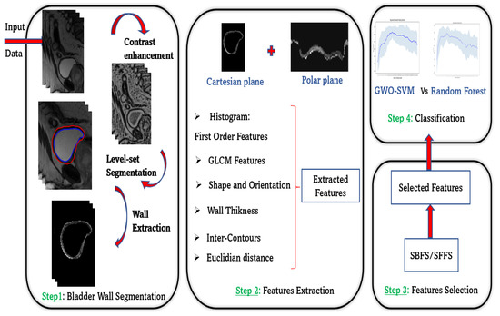 (1) Background: Segmentation of the bladder inner’s wall and outer boundaries on Magnetic Resonance Images (MRI) is a crucial step for the diagnosis and the characterization of the bladder state and function. This paper proposes an optimized system for the segmentation and the classification of the bladder wall. (2) Methods: For each image of our data set, the region of interest corresponding to the bladder wall was extracted using LevelSet contour-based segmentation. Several features were computed from the extracted wall on T2 MRI images. After an automatic selection of the sub-vector containing most discriminant features, two supervised learning algorithms were tested using a bio-inspired optimization algorithm. (3) Results: The proposed system based on the improved LevelSet algorithm proved its efficiency in bladder wall segmentation. Experiments also showed that Support Vector Machine (SVM) classifier, optimized by Gray Wolf Optimizer (GWO) and using Radial Basis Function (RBF) kernel outperforms the Random Forest classification algorithm with a set of selected features. (4) Conclusions: A computer-aided optimized system based on segmentation and characterization, of bladder wall on MRI images for classification purposes is proposed. It can significantly be helpful for radiologists as a part of spina bifida study.