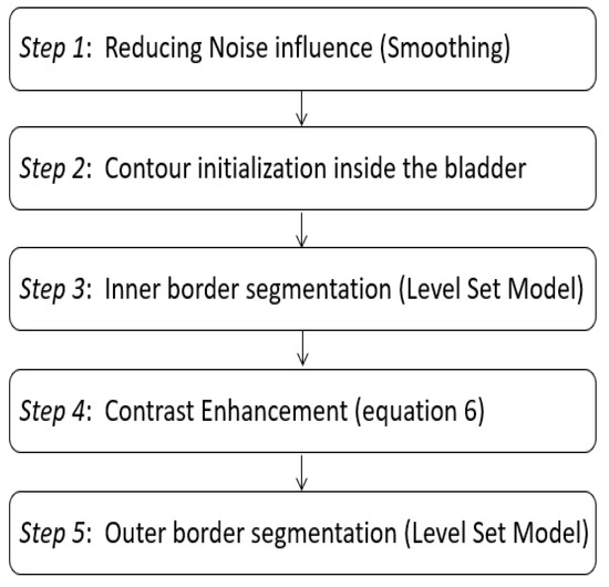 For this purpose, several segmentation strategies have been published in the literature [4,5,6]. As is also known, segmenting the inner bladder border is much easier than the outer one [7]. This is why, in many previous publications, only the inner border is segmented using an algorithm, whereas the outer border is segmented manually. Nonetheless, an automatic or semi-automatic segmentation of the bladder wall is already proposed in some previous publications. Contour-based segmentation methods have shown their robustness through several previous studies, especially Level-set segmentation, which is widely applied in bladder wall segmentation. Actually, in [8,9], and to segment inner and outer bladder boundaries, the authors proposed an adaptative shape prior constrained directional level set model with the exploitation of the prior knowledge of region information and bladder wall minimum thickness. A minimum thickness constraint of 1 mm is adopted to avoid an overlap between the outer and the inner zero level set. An adaptative -weighted images level set segmentation strategy is also proposed by Duan et al. in [7]. Authors propose a coupled level set framework (two collaborative level set functions with an adaptative clustering algorithm) able to segment the inner and the outer bladder wall borders simultaneously for thickness measurement. The proposed framework was also compared to the Chan-Vese LS model [5], a segmentation algorithm based on level sets and designed to segment objects without clearly defined boundaries. A unified expectation-maximization (EM) approach with coupled level-set (CLS) constraints and a novel adaptative Markov Random Field model was also proposed by Hao Han et al. in [10] in order to segment the bladder wall in magnetic resonance imaging-based virtual cystoscopy. CLS was developed in order to preserve the continuity of the wall surface and to reduce the influence of artefacts adjacent to the bladder. Siqi Chen and Richard J. Radke [11] have also proposed a level-set segmentation approach based on both shape and intensity of prior information characterizing the image information using the intensity distributions inside the contour, outside it and over the entire region. In another more recent study [12], Wenjun Chi et al. segmented the bladder wall in MRI using coupled level set methods. Both of -W and -W modalities were used to detect inner and outer boundaries. Thus, there are many level-set based segmentation studies that have shown promising and robust results. Level set was also combined with deep-learning neural network in some recent studies in order to segment the urinary bladder such as in [13], in which Kenny H. Cha et al. developed a computerized system for bladder segmentation. This system starts with a deep learning convolutional neural network (DL-CNN) helping in the differentiation between the inside and the outside of the bladder and providing a seamless mask useful for guiding level set algorithm used here only to refine the segmentation. Deep learning completed by level sets was also the segmentation strategy of Gordon et al. in [6,14]. In fact, aiming to detect the inner and outer bladder wall in CT urography, authors firstly construct a DL-CNN likelihood map used after that as an energy term in the energy equation of a cascade level set methods. Many recent studies also proposed segmentation approaches uniquely based on deep learning [4,15,16,17] providing important segmentation results, but deep learning approaches often require a large database to afford the most reliable results.