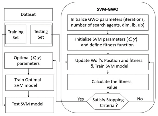 The flowchart of our proposed GWO-SVM algorithm.