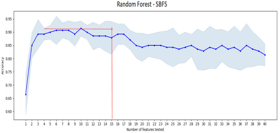 SBFS algorithm starts with the full set of extracted attributes (size = 40), and sequentially removes the feature related to the smallest decrease in the objective function’s value; in other words, we remove the feature that gives the lowest performance [22,28].