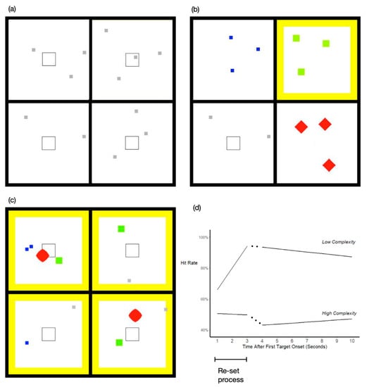 Sanocki and Sulman [23] further increased the complexity, in search of a catastrophic breakdown. Combining two complexity manipulations in a second type of multi-tasking condition resulted in a breakdown, and a complete elimination of efficient set-up. This result is shown in the bottom function in Figure 1d (highest complexity). Processing efficiency never increased after a target detection; the observers lost their ability to become efficient. In contrast, the same observers were able to set up efficiency in the less complex single-tasking condition. The elimination of effective re-setting in the highest complexity condition is a potentially profound result.