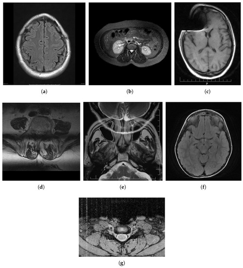 - Patton, J.A.; Kulkarni, M.V.; Craig, J.K.; Wolfe, O.H.; Price, R.; Partain, C.L.; James, A.E., Jr. Techniques, pitfalls and artifacts in magnetic resonance imaging. Radiographics 1987, 7, 505–519. [Google Scholar] [CrossRef]