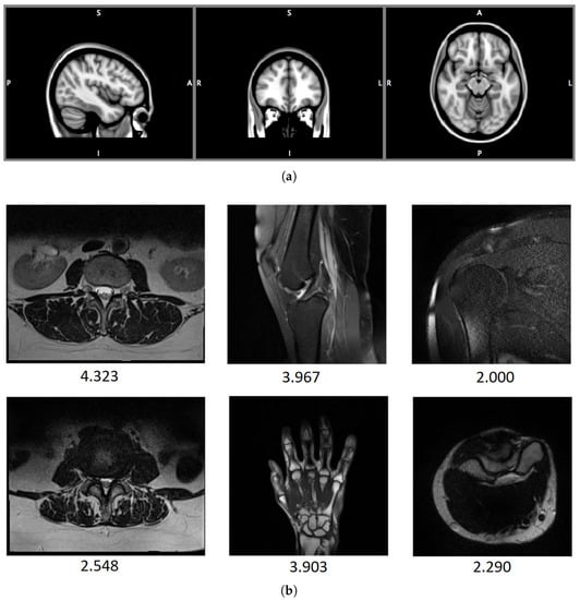 - Jang, J.; Bang, K.; Jang, H.; Hwang, D.; Initiative, A.D.N. Quality evaluation of no-reference MR images using multidirectional filters and image statistics. Magn. Reson. Med. 2018, 80, 914–924. [Google Scholar] [CrossRef]