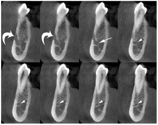 The acquired volume was reconstructed as axial images with a voxel size ≤ 200 µm. Using a dedicated tool for dental planning, this high-resolution dataset was further reconstructed as multiplanar images (200-µm-thick), perpendicular to the curvature of the mandible (cross-sectional images). Cross-sectional images are the most appropriate reconstructions to evaluate the presence and size of the MIC and its relationships with the adjacent mandibular anatomical landmarks (Figure 2).