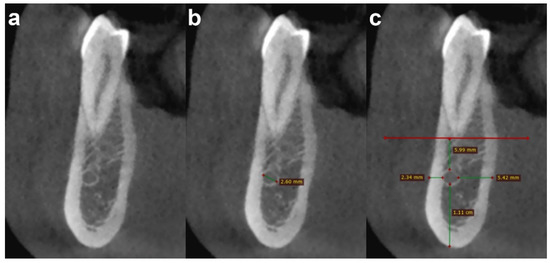 Cross-sectional CBCT images show an example of the steps of image analysis of the MIC at the first premolar level, as follows: (a) detection; (b) diameter measurement; and (c) distance measurement from adjacent anatomical landmarks (cortical plates and first premolar apex).