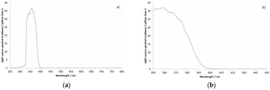The Baader U-Venus filter provides strong out-of-band blocking in the visible and IR regions [23], and the resultant illuminant light is comprised of UV between 320 nm and 400 nm. The small shoulder on the irradiance curve at 280 nm and 320 nm is due to the effects of stray light in the spectrometer rather than transmission light by the filter and is sometimes seen with spectra from solid-state spectrometers, especially when dealing with filters with sharp cutoffs [24]. As shown in Figure 1, the light source irradiance peaked at around 37 µWcm−2 nm−1 at about 360 nm, which is similar to the intensity of UV light in sunlight at sea level, as reported in [25]. As such, UV damage to the filters during the tests described here was not expected.
