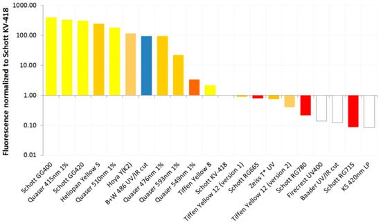 It should be noted that the fluorescence in Figure 2 is shown as a logarithmic scale because there is such a wide range of fluorescence in the test filters. Some filters, such as the Schott GG400 and GG420; the Quaser 415 nm, 476 nm and 510 nm; the Heliopan Yellow 5; and Hoya Yellow Y(K2), exhibited extremely strong fluorescence under UV light, while others, such as Schott KV-418, Baader UV/IR cut, Tiffen Yellow 12, the RG series IR filters, Firecrest UV400 and Zeiss T* UV, showed very little if any visible fluorescence. There were almost four orders of magnitude differences in the degree of fluorescence between the filters tested. The Quaser filters (sometimes reported with the spelling Quasar) seem to be long pass filters similar to the Schott OG and GG range and were part of a range of forensic imaging filters sold by Mason Vactron [26]. Schott KV-418, which is commonly used as a UV blocking filter in fluorescence imaging, exhibited a very low degree of fluorescence; however, a number of the filters tested here showed similar or even lower fluorescence.