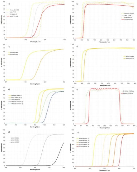 Optical transmission spectra of the test filters: (a) Firecrest UV400, Schott KV-418, Zeiss T* UV and KS 420 nm LP from 375 nm to 450 nm; (b) Firecrest UV400, Schott KV-418, Zeiss T* UV and KS 420 nm LP extended range from 350 nm to 800 nm; (c) Schott GG400 and GG420 from 375 nm to 450 nm; (d) Schott GG400 and GG420 from 350 nm to 800 nm; (e) Heliopan Yellow 5, Hoya Yellow Y(K2), Tiffen Yellow 8, Tiffen Yellow 12 (version 1 and 2) from 300 nm to 600 nm; (f) B + W 486 UV/IR cut and Baader UV/IR cut from 300 nm to 800 nm; (g) Schott RG665, RG715 and RG780 from 600 nm to 800 nm; (h) Quaser 415 nm 1%, 476 nm 1%, 510 nm 1%, 549 nm 1%, 593 nm 1% from 300 nm to 700 nm.