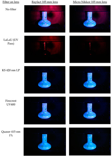 A glass vase was imaged under UV illumination (lighting was as described in Section 2.1, with the vase being placed at a distance of 40 cm from the light source). The images were captured using a Canon EOS 6D camera. Two lenses were tested; a Rayfact 105 mm f4.5 UV lens and a Micro Nikkor 105 mm f4. Images were captured with no filter on the lens and with either the KS 420 nm LP, Firecrest UV400, Quaser 415 nm 1%, or a LaLaU UV pass filter. The LaLa U UV pass filter (UVIROptics, Eugene, OR, USA) blocks visible and IR light while letting UV pass. Camera settings and image analysis were as described in Section 2.2, and all exposures were 1/2 s.