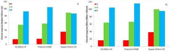 As shown in Figure 5, with the KS 420 nm LP and Firecrest UV400 filters, the red, green and blue responses are very similar for both test lenses. However, with the Quaser 415 nm 1% filter, the red and green responses are much higher than with the other filters. The Quaser 415 nm 1% filter showed a strong yellow fluorescence under UV light (Figure 2), and it is likely that the increased red and green channel response seen for that filter is due to its yellow fluorescence. Overall, this demonstrates how both the transmission and fluorescence characteristics of a UV blocking filter can influence the color balance of the final image. This behavior is important for applications where color accuracy is important such as forensics, art conservation and dermatology [1,2,3,4,7,15,19].