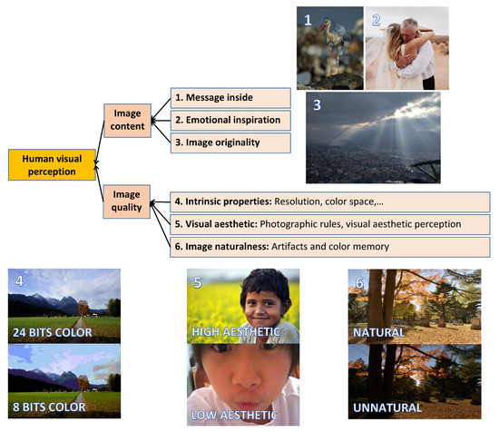 On the other hand, image perception might be based on Image Quality (IQ), which is not supposed to be related to image content. In this paper, we are focusing on IQ only. IQ, in this study, is defined in an explicit way. It is generally based on three notions: intrinsic properties, Image Aesthetic (IA—this work considers this notion related to visual aesthetic only, other aspects related to image content are not considered in this study) and Image Naturalness (IN). “Intrinsic properties” is a notion related to some technical aspects of photos, such as resolution, color space, color depth and image format (see Figure 1(4) and Figure 2). This notion mostly refers to the properties of the image acquisition device, and it is not related to any external factors induced by viewers’ experiences or contexts. In the past, intrinsic properties were the main factor influencing IQ since acquisition device performances were not so good (low resolution, optical or chromatic aberrations). However, this has been reduced because of the improvement in the technology, so the role of intrinsic properties in IQ is less and less significant. That is the reason why, in our study, we make the assumption that intrinsic properties do not influence IQ on the image databases we are dealing with.