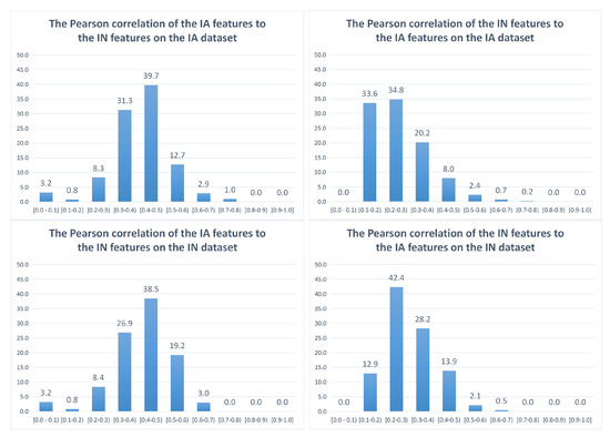 Figure 4 shows the Pearson correlation between IA and IN features. Specifically, the horizontal axis represents groups of correlation values, while the vertical axis shows the proportion of features (in percentages). In the IA dataset, it appears that a small part of IA features is highly correlated (the highest correlation of the features is higher than 0.5) to the IN features (15.6%), while the majority of IA features are moderately correlated (the highest correlation of the features ranges from 0.3 to 0.5) to the IN features (71%). Moreover, a minority of IA features (13.4%) is weakly correlated (the highest correlation of the features is lower than 0.3) to the IN features. There is a similar trend in the IN dataset, where 22.2%, 65.4% and 12.4% of IA features are highly correlated, moderately correlated and weakly correlated to the IN features, respectively. In contrast, the IN features seem to be less correlated to the IA features since the majority of IN features are weakly correlated to the IA features (68.4% in the IA dataset and 55.3% in the IN dataset), while only 3.3% and 2.6% of IN features are highly correlated to the IA features in the IA and IN datasets, respectively.
