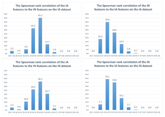 Similarly, Figure 5 shows the Spearman rank correlation between IA features and IN features. The results based on the Spearman rank correlation coefficient are quite similar to the results with the Pearson correlation coefficient. The majority of IA features are highly correlated and moderately correlated to the IN features (13.6% and 77.2% in the IA dataset and 22.8% and 62.3% in the IN dataset, respectively), while a significant part of IN features is weakly correlated to the IA features (58.2% and 46.2% in the IA dataset and the IN dataset, respectively). Besides this, only 3.3% and 4% of IN features are highly correlated to the IA features in the IA dataset and the IN dataset, respectively.