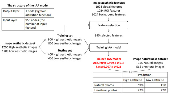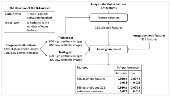 In order to evaluate the influence of IN features on IAA, we propose to train an IAA model by considering IN features only, including 14 highly correlated, 120 moderately correlated and 291 weakly correlated features. The performance of this model is compared with the one based on IA features only and the one based on the combination of IA and IN features. Figure 6 presents the process of the experiment and the results. The proposed IAA model contains an input layer (the number of input nodes is the number of input features) and an output layer (one output node with sigmoid activation function, a very simple linear model is considered because, in this study, we want to focus on the impact of features instead of the architecture of the model) is trained to perform a binary classification between high and low aesthetic photos. The Adam optimizer and a binary cross-entropy loss function are used, and the batch size is assigned to 100. The learning rate and the number of iterations are set to and 150, respectively. The IAA model is trained and tested on the IA dataset coming from [35]. The IA dataset labeled by humans is split into a training set containing 1600 images (two0thirds of the dataset) and a testing set including 800 images (one-third of the dataset).
