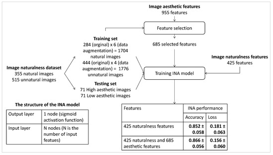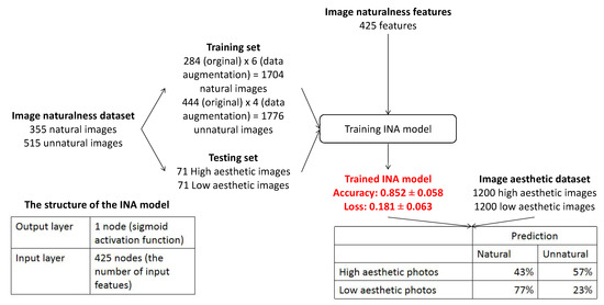 Similarly, INA based on IA features only is investigated in which the IA features include the 228 highly correlated the 669 moderately correlated, and the 127 weakly correlated features. The performance of INA based on IA features is compared with the one based on IN features only and the one based on the combination of IA features and IN features. The process of the experiment and the experiment results are presented in Figure 7. Starting with the considered IN dataset [1], in order to balance the number of natural and unnatural photos in the training set, a data augmentation process is applied to generate augmented versions of natural and unnatural photos by re-scaling, cropping and padding. Naturalness labels of augmented versions are kept the same as the labels of the original images. A training set (generated from 84% of the dataset) containing 1704 natural photos (284 original photos × 6 data augmented versions) and 1776 unnatural photos (444 original photos × 4 data augmented versions) and a testing set containing 71 natural photos and 71 unnatural photos (16% of the dataset without data augmentation) are extracted. The structure of the INA model and training parameters are set the same as in the previous experiments.