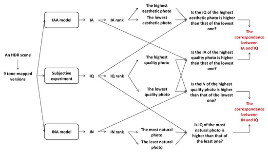 Figure 12 illustrates the whole process of estimating the correlation between IQ and IA and between IQ and IN. First, starting with the subjective IQA experiment presented in [10], 10 HDR scenes are considered, and 9 different tone-mapped versions are generated from each HDR scene by using simple linear clipping with inverse gamma correction, Drago [52], iCAM06 [53], Mantiuk [54] and Mai [55] tone-mapping operators with different parameter settings. These photos are categorized by scene, so there are nine tone-mapped versions and an HDR photo in each category. Possible tone-mapped image pairs in each category have been shown to 20 naive observers with and without reference. In their first test, observers had to choose which image they preferred between the two mapped versions of a given pair. Those images have been displayed on an SDR screen with a background luminance of 50 cd/m2 and a max luminance of 200 cd/m2. In the second test, not only a given pair but also a reference displayed on an HDR screen (background luminance of 100 cd/m2 and max luminance of 4000 cd/m2) was shown to viewers each time, and they had to answer the same question as in the first test (see Figure 13). The experiments were performed according to the ITU-R BT.500-11 for a subjective experiment. In those experiments, some images closer to the reference are preferred. However, some images less similar to the reference are sometimes preferred because they are more appealing. This subjective experiment is based on viewers’ global preference only: IA and IN are not mentioned in that experiment. Considering an HDR scene, Figure 14a shows the pair comparison matrix of the nine versions mapped from the HDR scene in which presents the number of times the ith tone-mapped version is preferred when comparing it to the jth version. It appears that the total number of observers for each pair is not the same, so the Bradley–Terry score Matrix is computed as in (3). The IQ of the ith tone-mapped version is then computed as in (4). The nine tone-mapped versions of each HDR scene are ranked based on IQ values. Figure 14b,c shows the Bradley–Terry score Matrix, IQ values and the IQ rank of the considered photos.