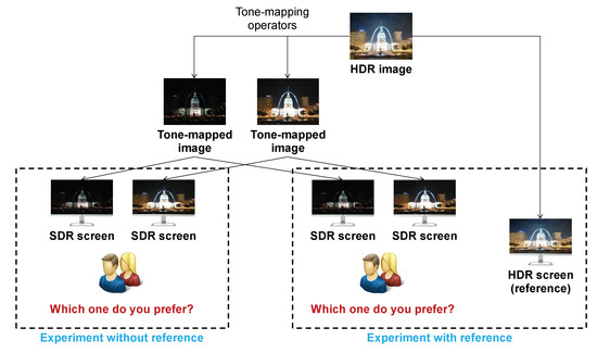 - Krasula, L.; Narwaria, M.; Fliegel, K.; Le Callet, P. Influence of HDR reference on observers preference in tone-mapped images evaluation. In Proceedings of the 2015 Seventh International Workshop on Quality of Multimedia Experience (QoMEX), Pilos, Greece, 26–29 May 2015; pp. 1–6. [Google Scholar]