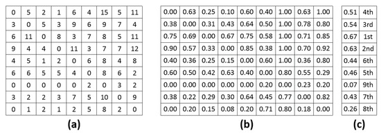 Process of pair comparison matrix analysis: (a) The pair comparison matrix of an HDR scene in which is the number of times is preferred when comparing to , (b) Bradley–Terry score Matrix of each HDR scene, (c) IQ and ranks of tone-mapped versions of each HDR scene.