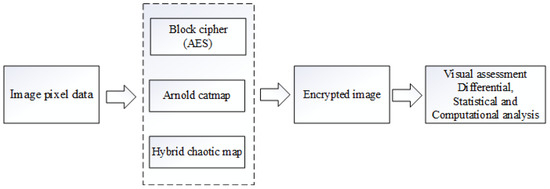 Digital image security has become a critical problem because many digital services, such as multimedia systems [1] and medical [2,3] and public internet communication [4], require reliable security for the storage and transmission of digital images. Moreover, the growth of the internet and mobile communications demands a secure communication system. Such a system needs to ensure that end user privacy has not been compromised in any way [5]. To this end, providing a higher level of security and maintaining the quality of data without losing the original image’s parametric properties are equally important. Therefore, it is quite essential to build a secure image encryption framework with better efficiency, confidentiality and quality [6]. The low scale performance and vulnerability of existing cryptosystems to security threats make them ineffective for image encryption [7]. Herein, the chaotic system with complex properties of ergodicity, unpredictability and sensitivity has opened the potential for their use in cryptography [8]. The standard encryption algorithms have mainly relied on two important properties of confusion and diffusion for their encryption capability [9], which are also included in the chaotic system, such as being ergodic and extremely sensitive to initial conditions and the system parameters to provide a strong secret key. Various chaos based image encryption systems have been proposed [8,10,11,12,13,14,15,16]. In these works, the chaotic map, an evolution function that demonstrates some of the chaotic behavior either in discrete-time or a continuous-time domain, was used for image encryption. Different chaotic maps such as 1D, 2D and 3D were experimented with for image encryption. Besides these single chaotic maps, such as the tent map [17], logistic map [18], Arnold cat map [8] and Henon map [19], there are few works that use a hybrid chaotic map by intermixing the result of one chaotic map with another chaotic map [20,21]. The hybrid chaotic map seems to have better security measurement parameters than the standalone chaos-based image encryption system.