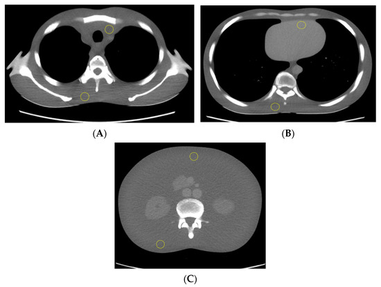 The phantom trunk is pictured supine with axial CT slices of the upper thorax (A), mid thorax (B), and abdomen (C). Two ROIs (yellow circle) were used to calculate the mean CT number measurements.