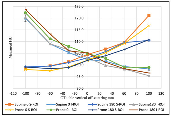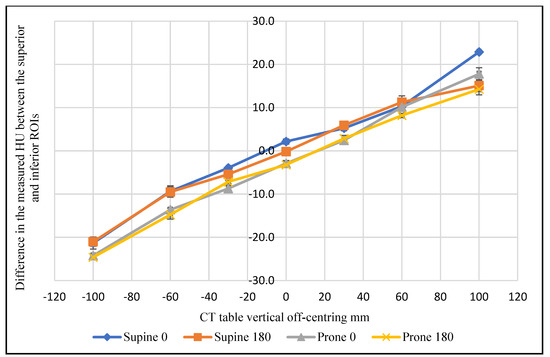 The findings in the abdominal region also showed a 4.4 HU change for the same superior ROI as a function of phantom position at +100 mm vertical off-centring using a 0° localiser radiograph. The inferior ROI behaved in the same way when the phantom was moved −100 mm from the iso-centre, recording a higher value in the prone position with a difference of 2.5 HU compared to the supine position (Figure 2).