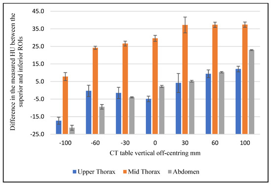 CT number values were recorded and averaged for three consecutive axial CT slices of the scanned phantom trunk in the upper thorax, mid thorax, and abdomen, as shown in Figure 1. Two regions of interest (ROIs) were plotted on superior and inferior regions in the selected image slice and used to measure the mean CT number in both supine and prone positions. The average CT numbers were measured using ImageJ software [21] and plotted against the phantom vertical off-centring with three tube voltages.