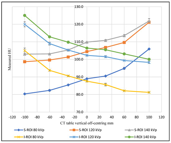 As a function of vertical off-centring, the CT number change was found to be affected by the tube voltage settings. There was no clear trend for the tube voltage influence across the scanned regions. However, the CT number change is seen to vary more at low tube voltage settings in some measurements (Figure 5). This can be explained by the fact that photoelectric absorption is more dominant at low tube voltages in contrast to Compton scattering, which predominates as the photon energy increases [24].