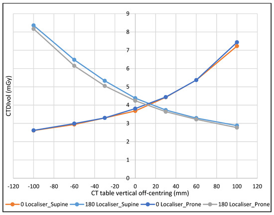 The volume CT dose index (CTDIvol) was recorded with each vertical off-centring increment and experiment configurations.