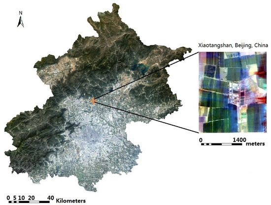 The study area at Xiaotangshan, Beijing, China (OMIS true color synthesis image, R = 699.2 nm, G = 565.4 nm, B = 465.0 nm).