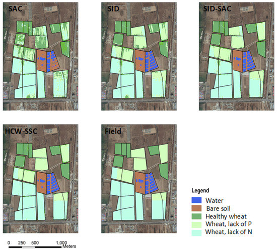 Classification maps of four different classification methods and the field measurement (spectral angle cosine (SAC), spectral information divergence (SID), spectral information divergence–spectral angle cosine (SID-SAC), and a new hybrid changing-weight classification method with a filter feature selection (HCW-SSC)).